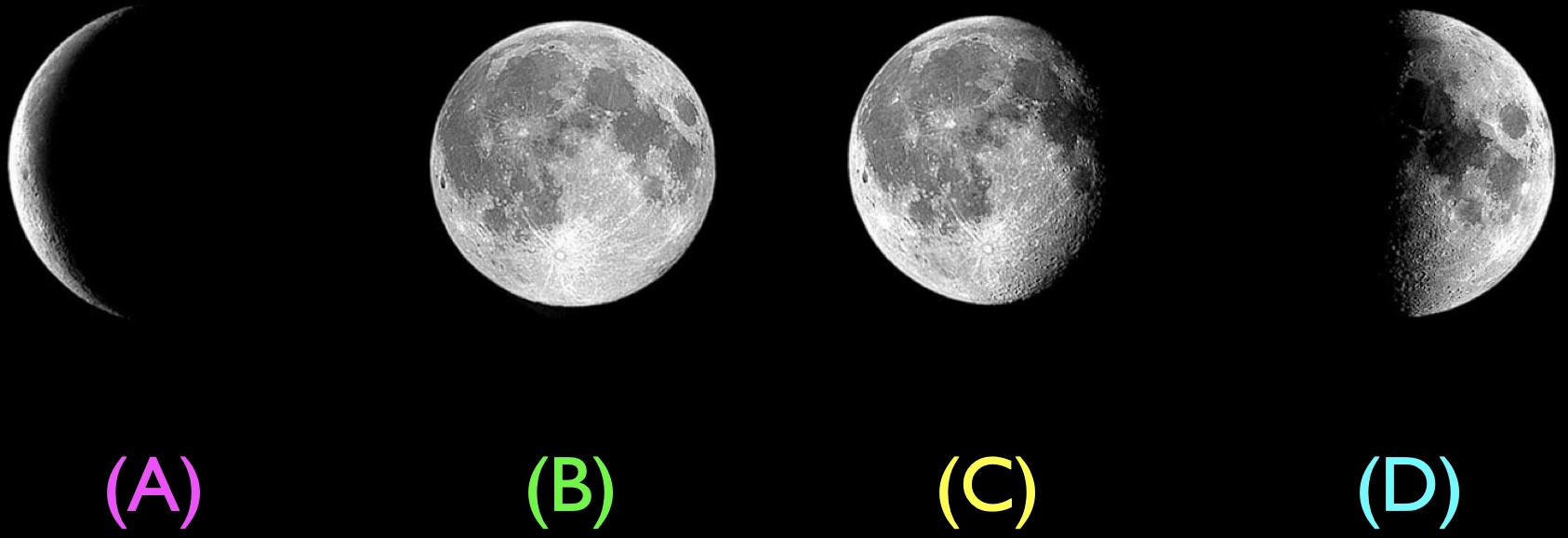 You observe a full moon rising in the East. What image best shows what it look like when it sets?